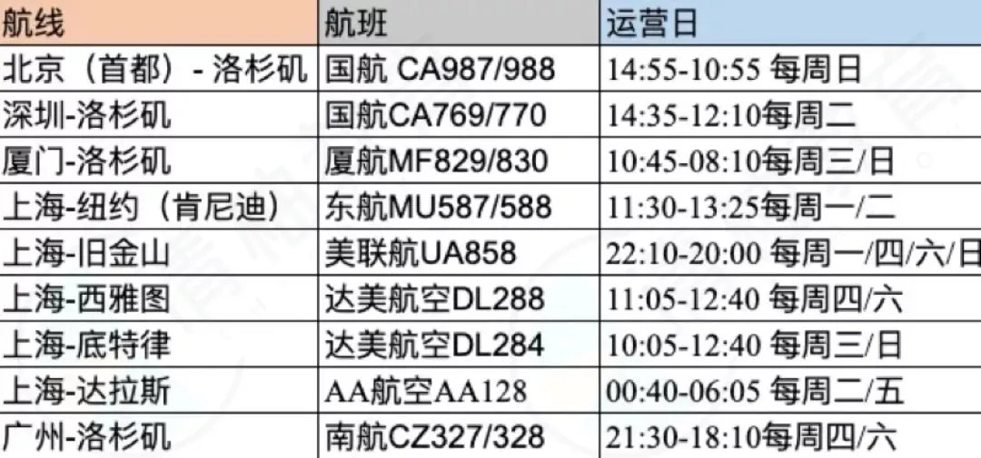 中国直飞美国,目前一共有18班航线。线路与疫情前相比大致不变,由国内四大航空加上美国三大航空公司运营。