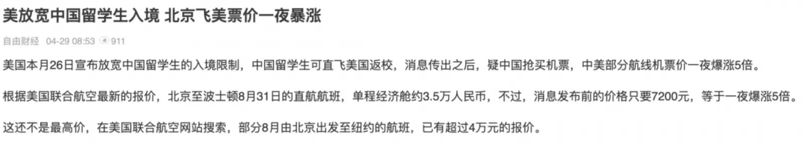 从4月26日赴美禁令解除后,中美直飞机票的价格也在一路狂涨,一夜之间暴涨5倍!本来6000块钱的机票瞬间涨到了2w+以上。