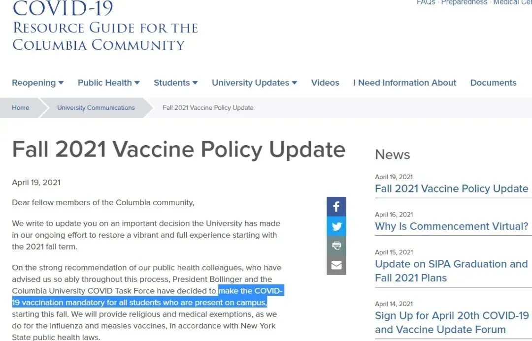 哥伦比亚大学4月19日官宣所有在校学生必须接种疫苗,并认可世卫组织批准的新冠疫苗。