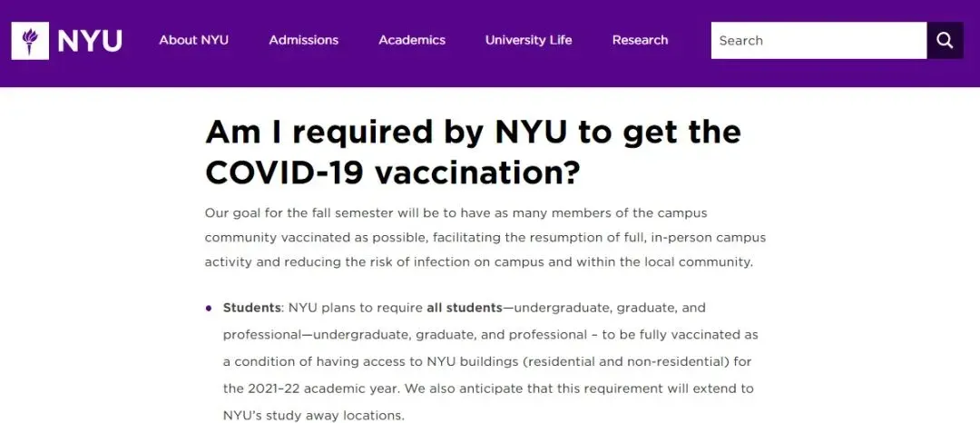 NYU学校官网在4月19日更新疫苗接种要求,2021-22学年的所有返校学生都要全面接种疫苗。