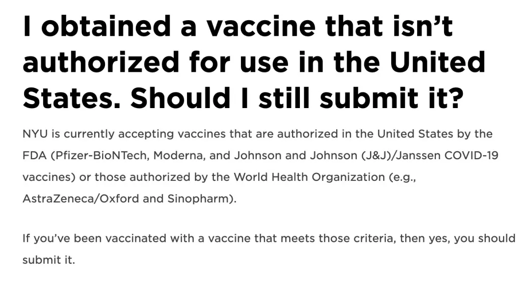 纽约大学鼓励所有符合接种条件的学生立即接种所在国家/地区批准的疫苗,也明确表示接受包括Sinopharm在内的WHO批准疫苗。