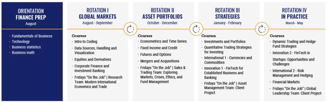 在这个10个月的STEM项目中,学生将完成四次在不同部门和团队中的轮换,在理论和实践中学习解决日益复杂的金融课题。