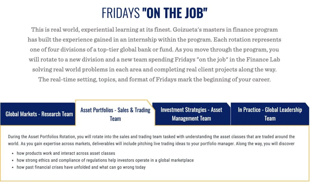 在完成这个项目的过程中,学生每周五将在金融实验室“工作”,轮流在代表着顶级全球银行或基金的四个部门进行学习。每次都会接触到新的团队,真正参与到客户项目中,学习解决每个领域的现实问题。