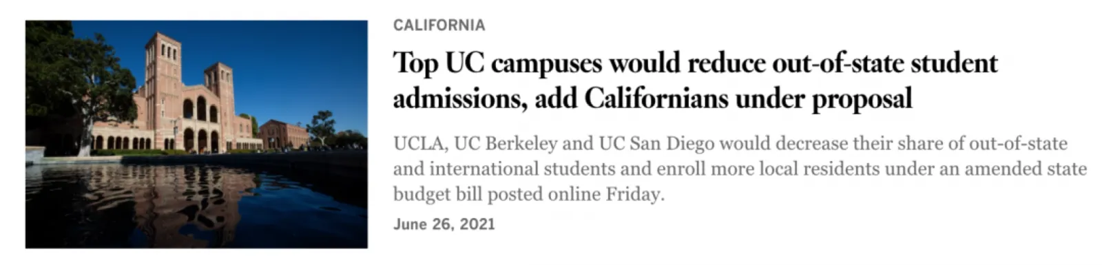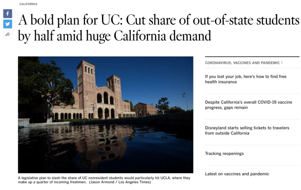 根据拟议的最新预算修订案,从2022年秋季开始的五年内,加州政府计划将UC系统三个最受欢迎学校(UC Berkeley, UCLA, UCSD) 的非加州本地本科学生比例,从超过22%减少到18%。