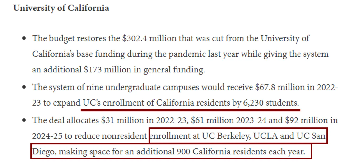 经过一个月的激烈辩论,这份“缩招政策”有了相当程度上的缓和,最终确定为文章开头的最新预算修订案:从2022年秋季开始的五年内,UCB、UCLA、UCSD三所分校的非加州本地本科学生比例,从超过 22%减少到18%。