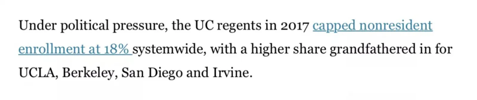 其实早在2017年,加州政府就曾要求UC采取行动。在压力之下,UC当时将州外学生的数量限制到了18%。