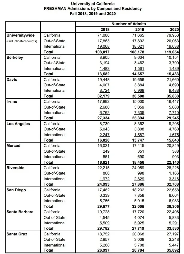 加州另一所申请量稍小的UCSD在2020申请季的国际生录取率是36%,州外居民的录取率是60%,而加州居民的录取率仅是34%。