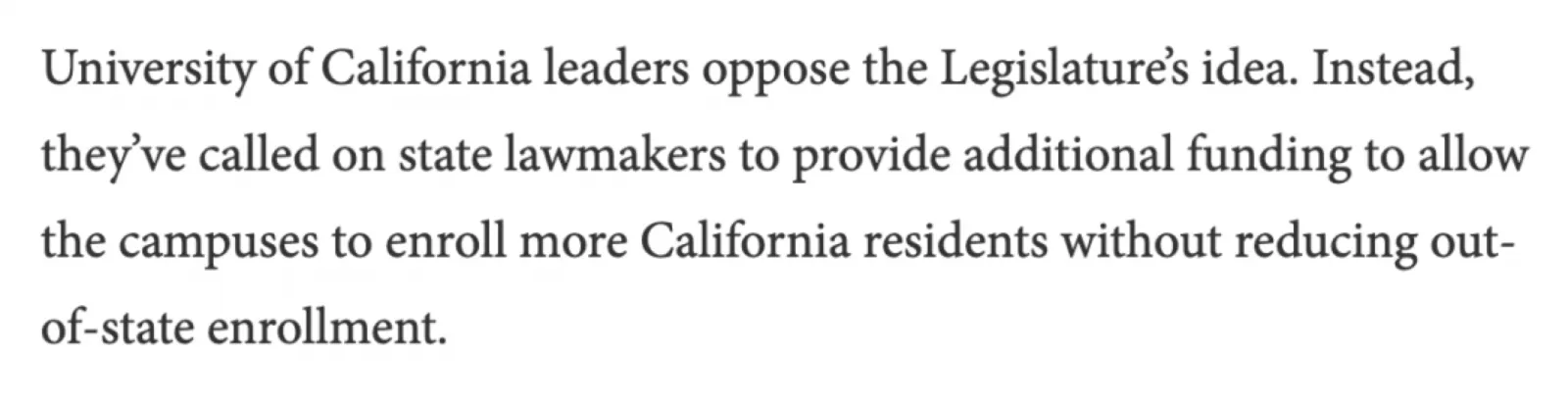 敦促UC缩减州外学生比例的主要原因,是加州立法者总是收到大量对于本州学生录取加州大学机会减少的抱怨: