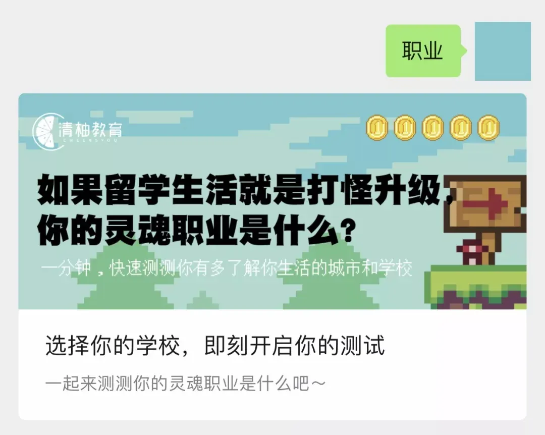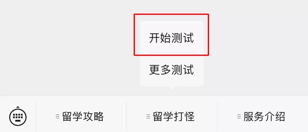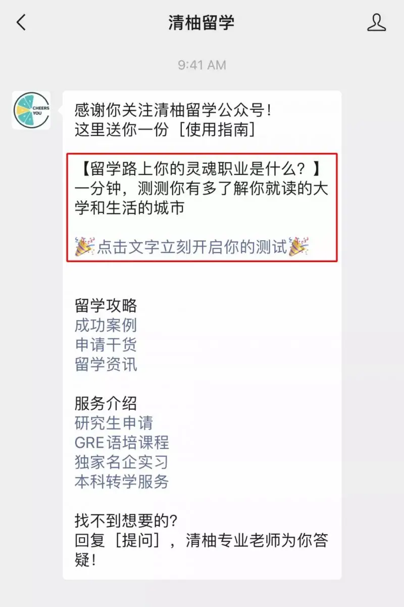 关注「清柚留学」公众号的新用户,在欢迎回复中就能看到测试链接,直接点击文字即可进行测试~