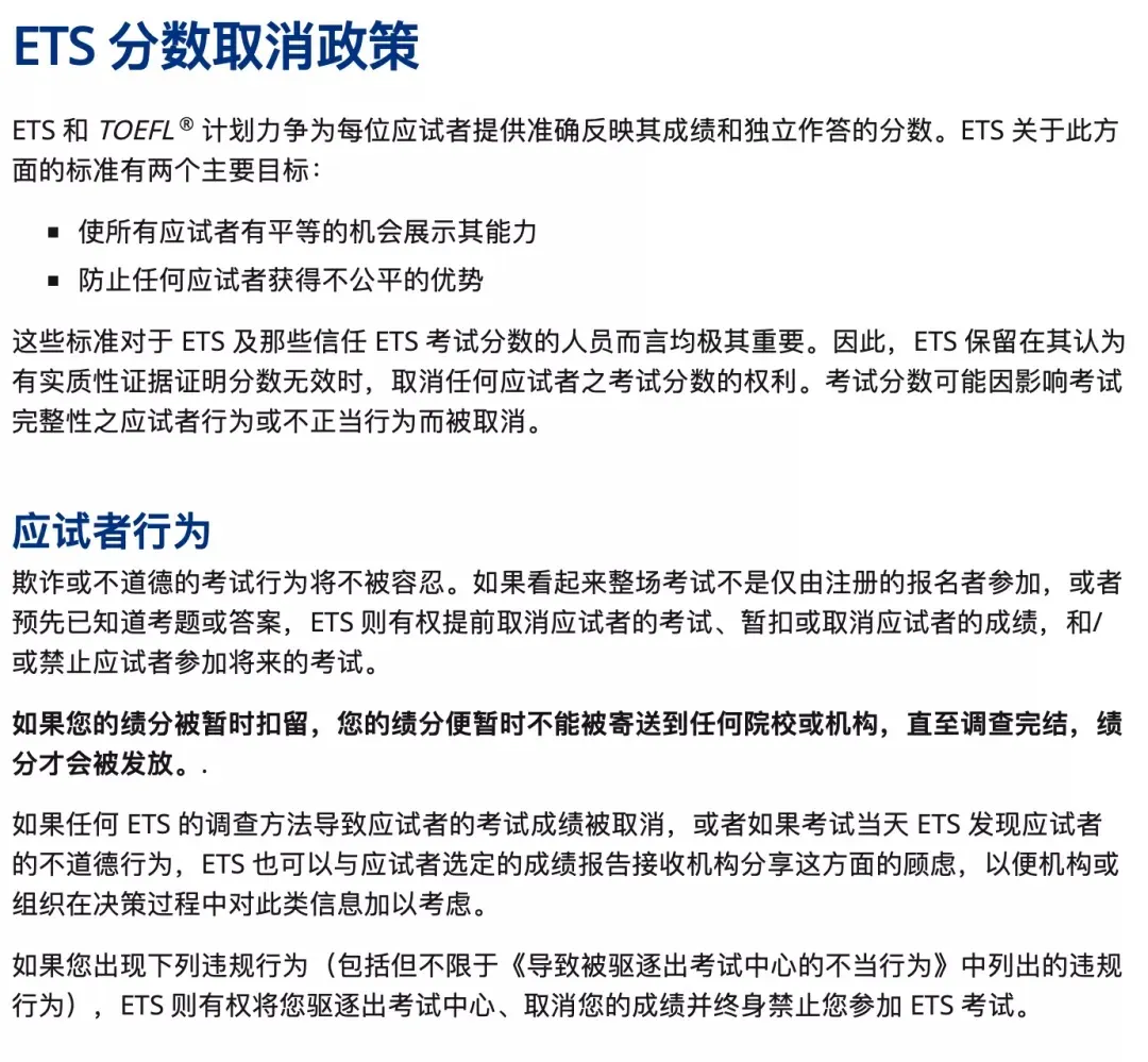 另外,ETS对作弊行为也一直保持绝不姑息,严惩不待的态度。一旦查处代考舞弊,不仅会取消单次考试成绩,包括一年禁考、终生禁考等。