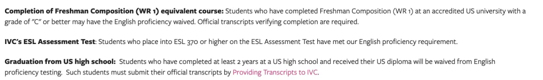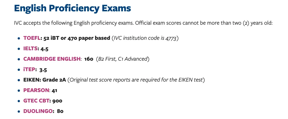 总体而言,社区大学对于语言成绩的要求并不算太高。拿IVC举例,该社区大学对于托福成绩的要求在52分左右,雅思要求在4.5分左右,或者对于多邻国的成绩要求在80分左右。