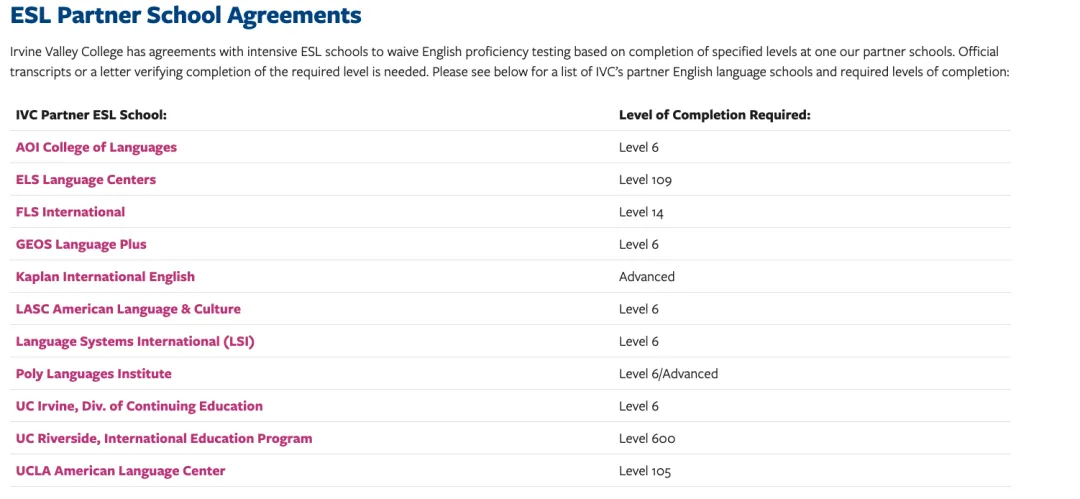 也有部分社区大学不需要语言成绩,只需在Partner School完成对应语言等级来满足英语要求。