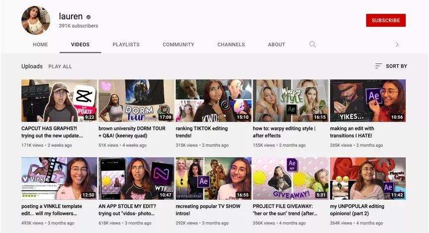 Lauren是在YouTube上拥有39.1万的博主,从2019年开始发布了剪辑、拍摄等技术流的视频。