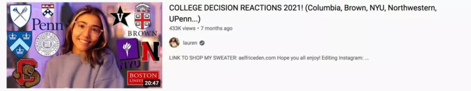今年4月Lauren在YouTube上发布了自己被哥伦比亚大学、布朗大学、纽约大学、西北大学、宾夕法尼亚大学等多所名校录取的视频,视频播放量达到43万,Lauren最终决定入读藤校布朗,这条视频也收到了很多粉丝的祝福。