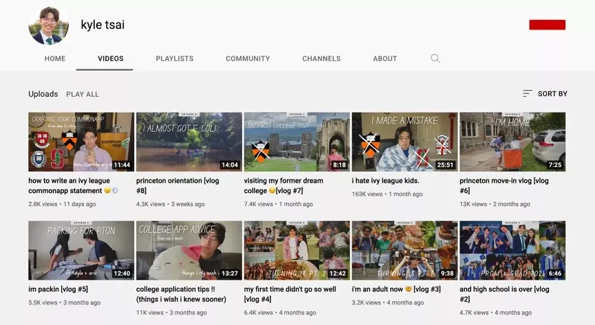 Kyle tsai依靠在Youtube上分享自己的日常和学习收获了1万粉丝,他的“college decision reactions”在平台上获得了接近80万的播放量。