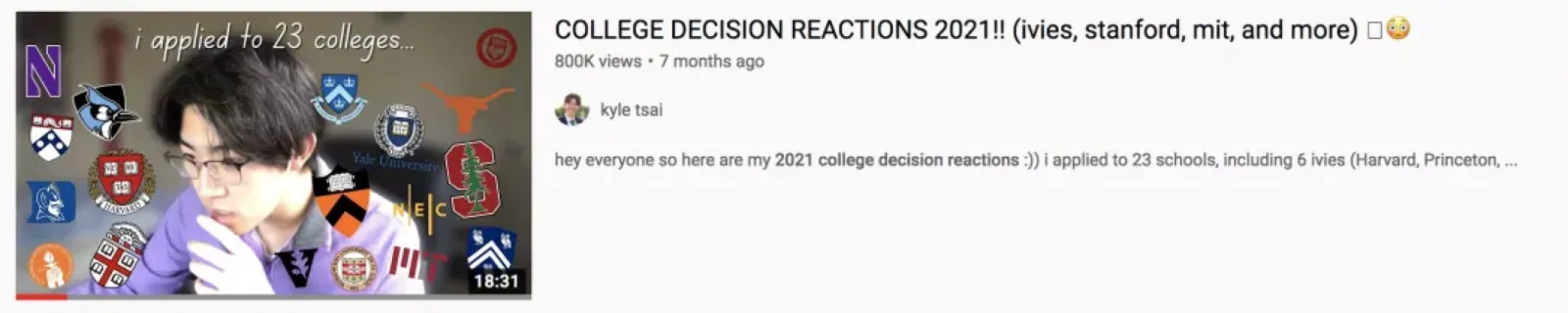 Kyle tsai讲述了自己历经3个月的准备,申请了23所学校,包括6所常春藤大学(哈佛、普林斯顿、布朗、哥伦比亚、耶鲁和宾夕法尼亚大学)的艰辛过程,随后他也发布视频,公布自己最终选择了普林斯顿大学读书,开启自己的大学生活。