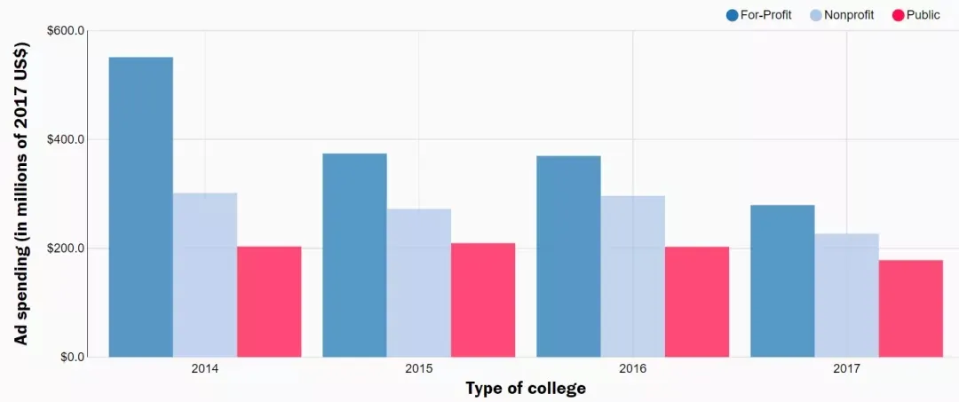 根据品牌咨询公司Kantar的数据,2018年美国大学在广告上的总支出为20亿美元,2019年为22亿美元。虽然这一数字在疫情期间有所下降,但今年第一季度的广告支出与去年同期相比几乎翻了一番,已经达到8.7亿美元。