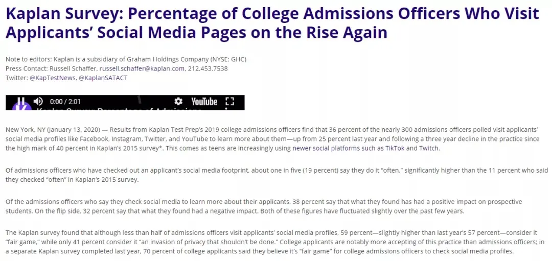 美国卡普兰研究所进行的一项调查显示,35%的大学招生官会在Facebook,Instagram和Twitter等社交平台上查看申请者的主页,这可以帮助他们选择合适的候选人,同时也可以筛选掉不适合的候选人。