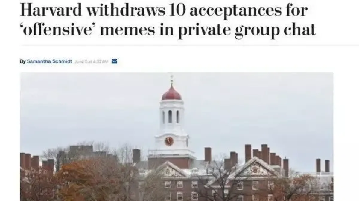 2018年6月,哈佛大学在已发放录取通知书的学生中,发现有10名学生在Facebook上加入了一个发表虐杀儿童,以及侮辱少数族裔言论的小组,随即取消了他们的录取通知书。