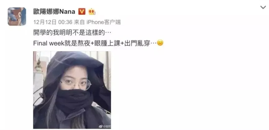 就连欧阳娜娜也不例外。她就曾经在微博上Po出自己无比憔悴的自拍,并配文“final week就是熬夜+眼肿上课+出门乱穿……”网友在评论区也高呼:“看到final周的留学党都一样丑,我就放心了”。