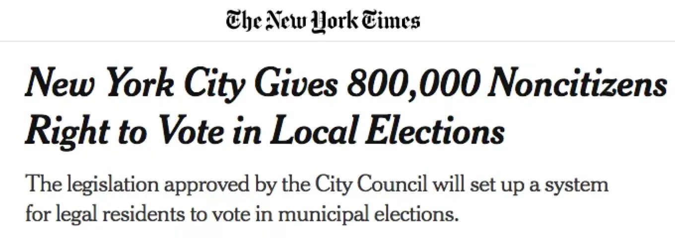 上周四,纽约市议会通过法案,将允许纽约市超过80万非公民(Non-citizen)身份的合法纳税人,获得纽约市级公职选举(Municipal election)的投票资格。