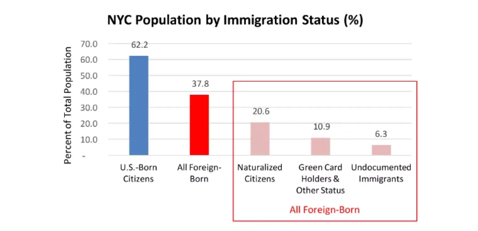 人口普查数据显示,纽约市800万常住人口中,移民人口约占37%。其中,近60%是入籍公民,其余为绿卡持有者、工签持有者、留学生以及无身份移民。