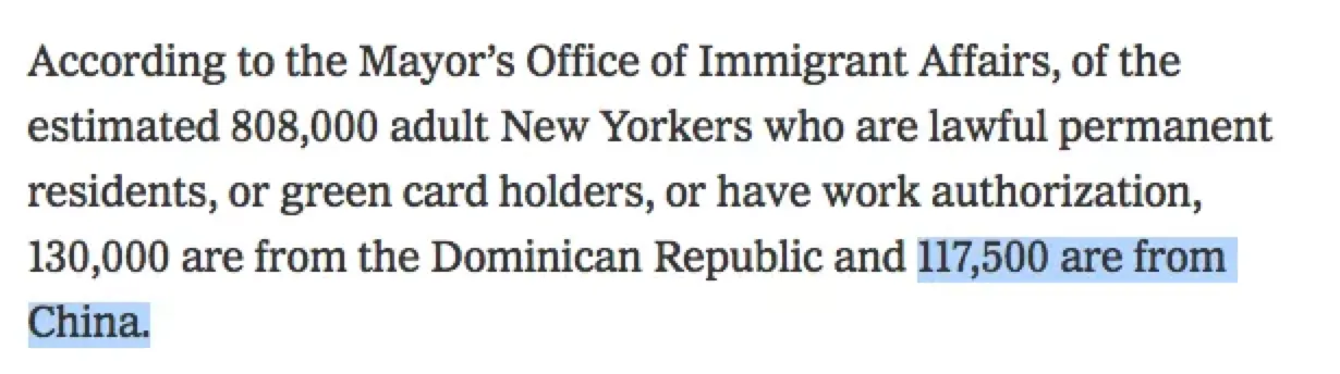 纽约市长移民事务办公室的数据显示,纽约有超过80万的非公民,他们或拥有合法永居身份,或是绿卡持有者,或持有工作许可。这其中有13万人来自多米尼亚共和国,超过11.7万人来自中国。