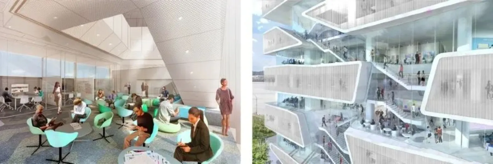 在如此强大的团队的打造下,哥大新商学院无处不透露出满满的设计感和科技感。全部建筑采用透明玻璃墙壁,确保了白天时室内的采光性和通透感。