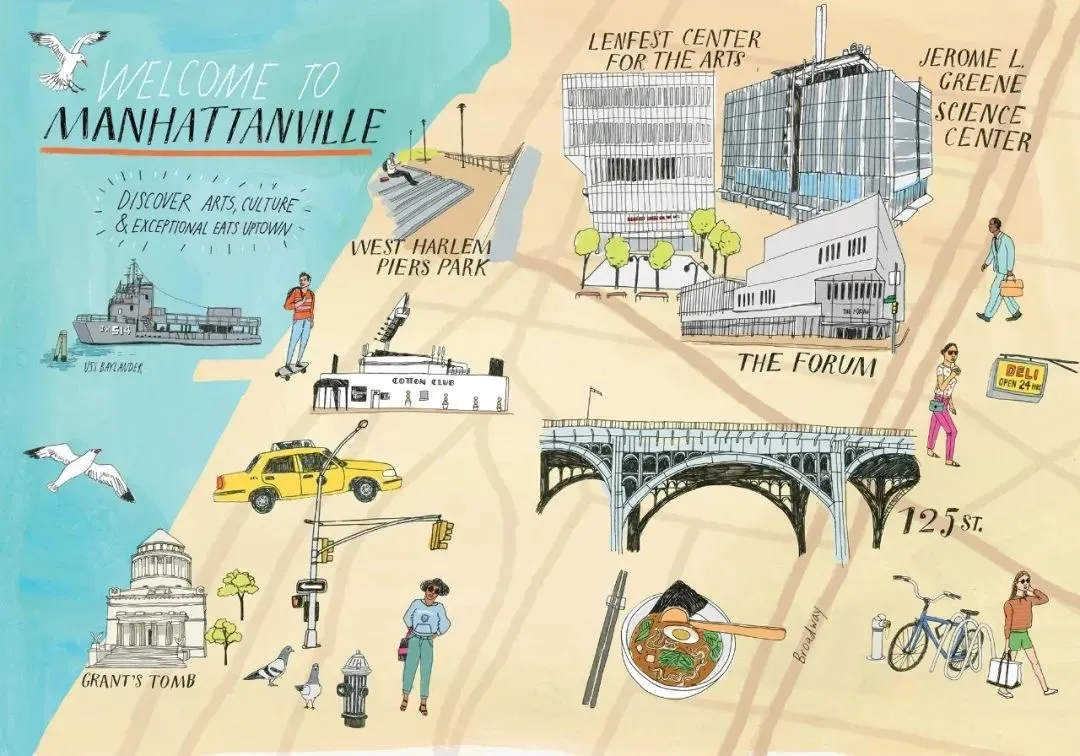 哥大新校区位于Manhattanville,毗邻哈德逊河,不仅是曼哈顿岛工业货运的入口点,也是客运的重要枢纽。
