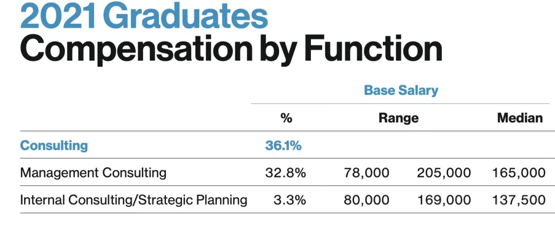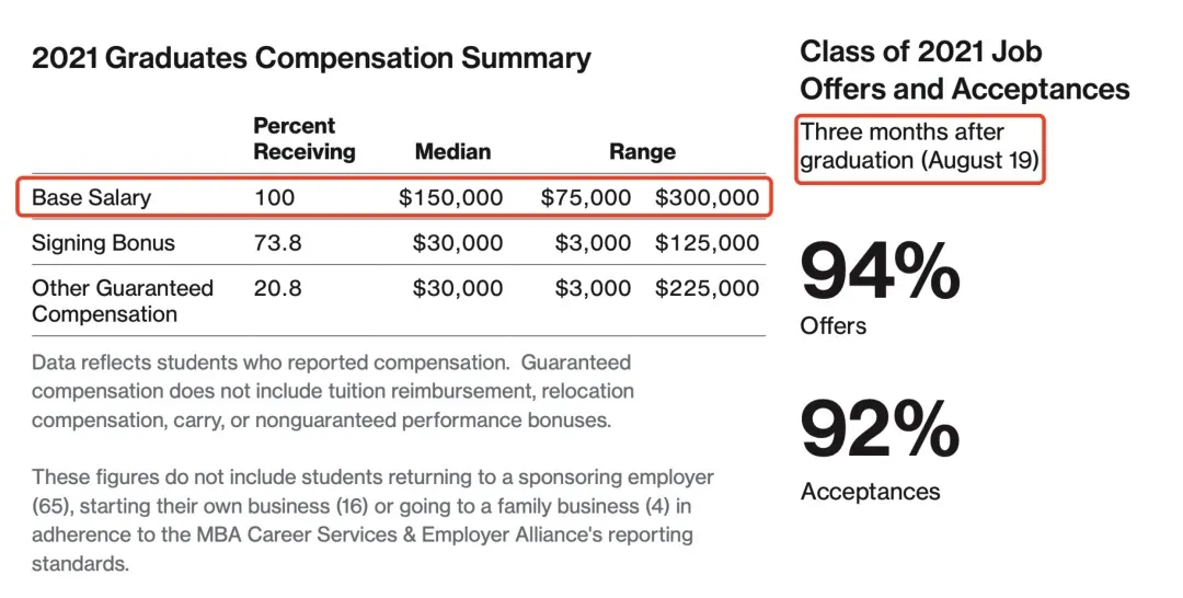 根据哥大商学院2021届毕业生职业报告来看,毕业生们的工资中位数在$150,000/年,毫无疑问是妥妥的高薪人群。同时,2021届毕业生在毕业三个月内找到满意工作并成功入职的比例为92%。