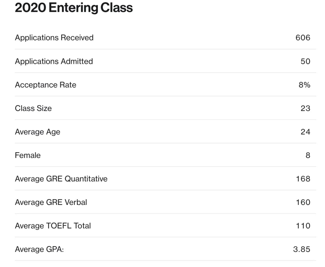 作为哥大商学院的火爆项目,该项目的录取率大概只有8%,每年项目的规模很小,只有不到25人,国际生名额就更为有限。