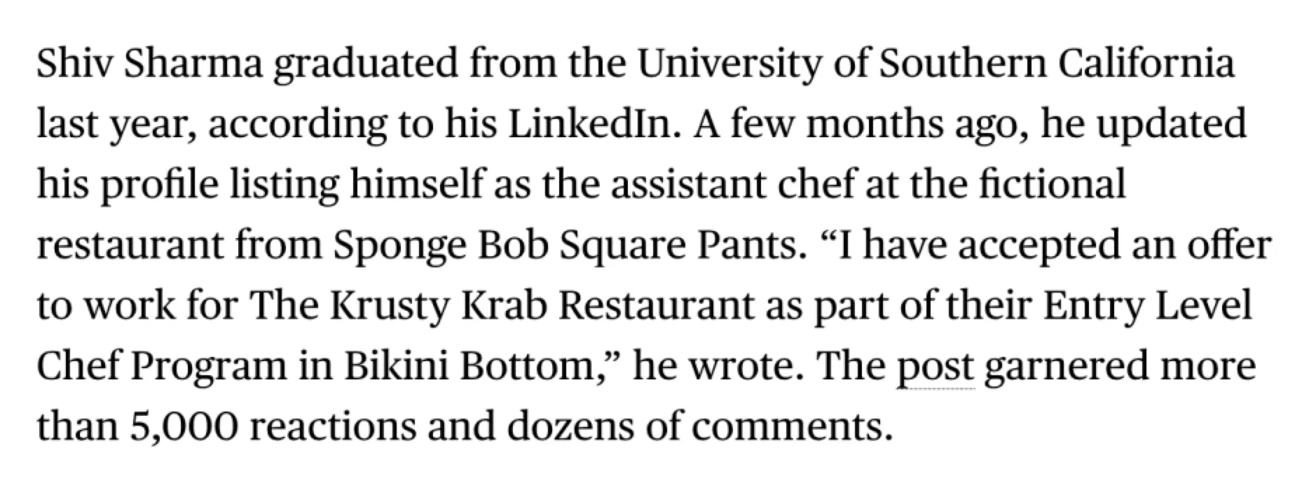 毕业于南加州大学,却在领英简介职位一栏中,主推自己在《海绵宝宝》的蟹堡王餐厅里做帮厨。