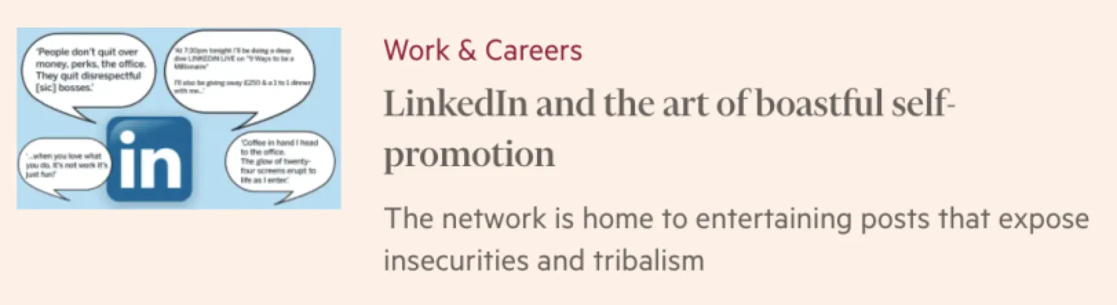 英国《金融时报》的专栏作家赖默·里格比认为,LinkedIn中的大部分内容都没有个性,只是从一堆管理术语中提取出来的几个词汇,然后进行重新拼凑。大家都说自己认真负责、工作态度积极、有丰富的相关经历、结果等于什么都没说。