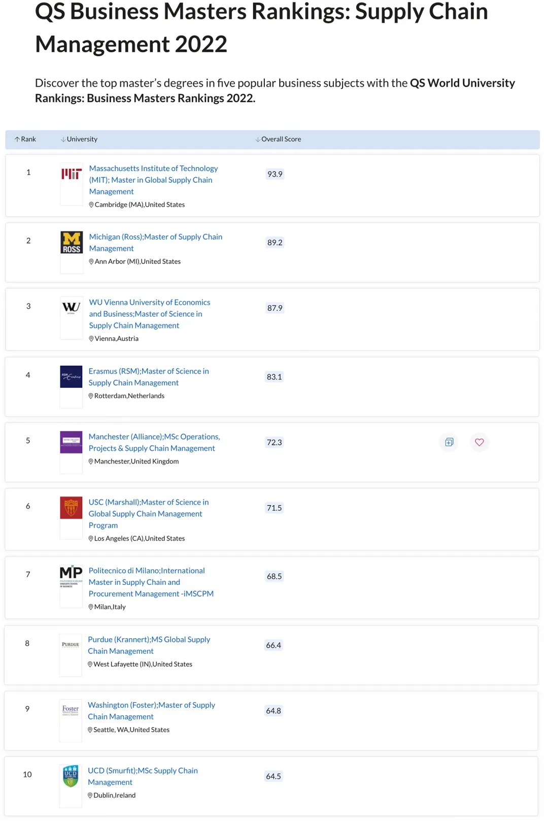 2022年发布的QS世界大学供应链管理专业排名,麻省理工学院排名第一,物流和供应链专业就设在Sloan商学院,并且专门有Supply Chain的方向。密歇根大学紧随其后。