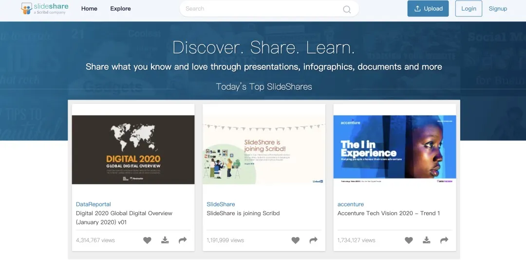 Sliedeshare是一个非常宝藏的模板网站!在上面有很多国际知名公司做的PPT,这些大厂的PPT其实做的都很高级。直接模仿他们模板用来做presentation,绝对是非常加分的!