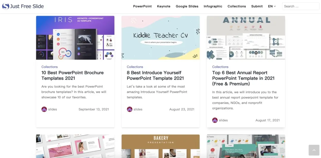 这个网站的PPT模板设计、配色都比较高级,是属于那种看一眼就不会忘记的设计。