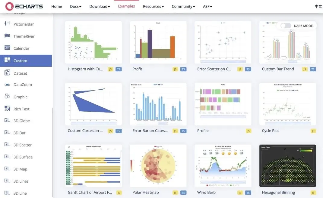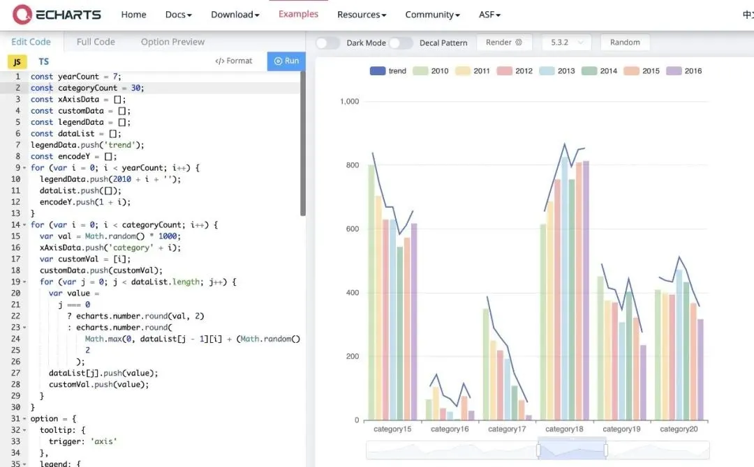 Echarts内附制作图表需要的code,用户只需将数据与口令输入进模版即可获得完美的可视化数据报告。