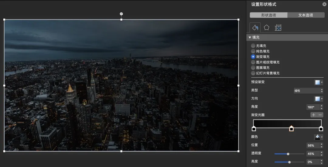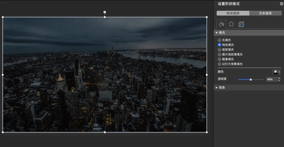 3. 根据需要,选择纯色填充或者是渐变填充,颜色选择黑色,调整透明度到自己满意的效果即可。