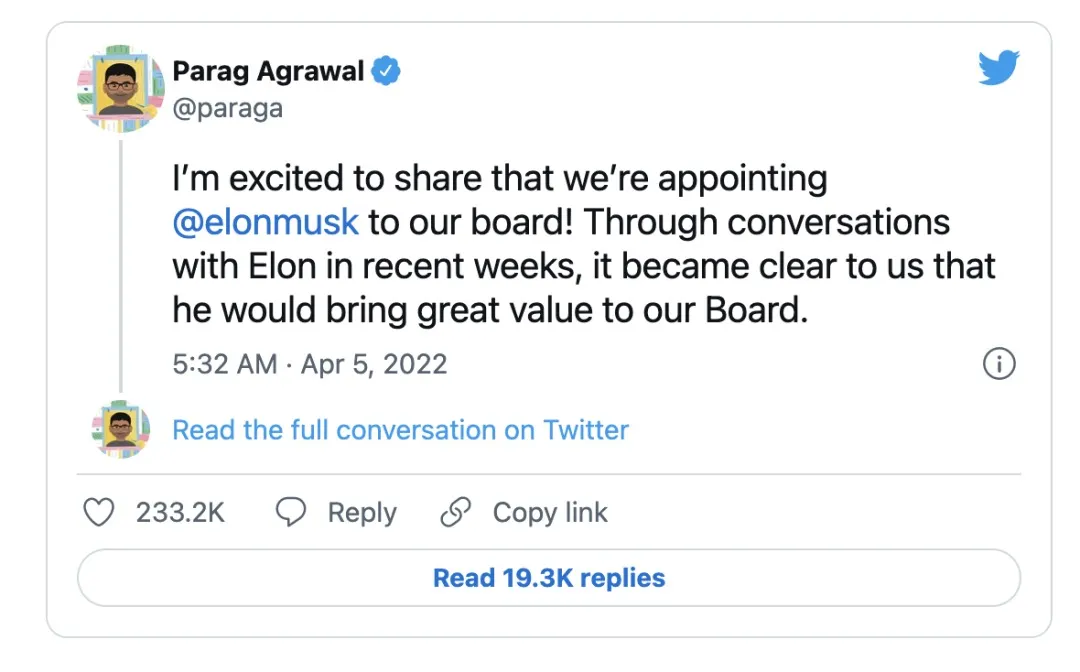 4月5日,最新SEC文件显示,马斯克已从“被动控股”变为“激进投资”。推特的首席执行官Parag Agrawal也发来贺电:“欢迎加入董事会。”