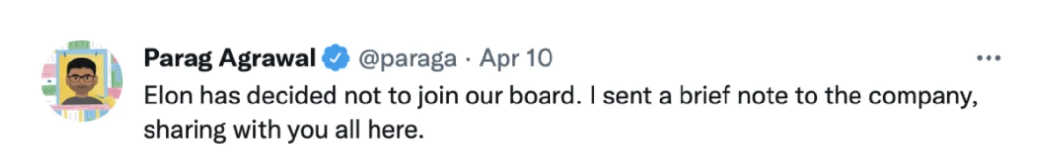 4月10日,变数出现。推特CEO再次发布推文:“马斯克决定不加入推特董事会。”