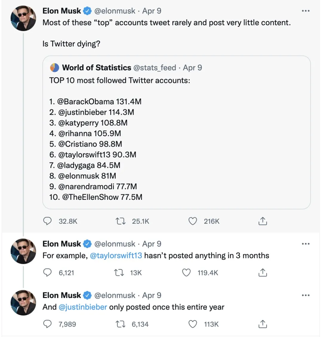 另外一边,马斯克则发表了“推特要完”的言论:“推特这些所谓的顶流早就名存实亡了。Taylor Swift过去3个月没有发推,Justin Bieber一年就发了一条。推特要完了吗?”