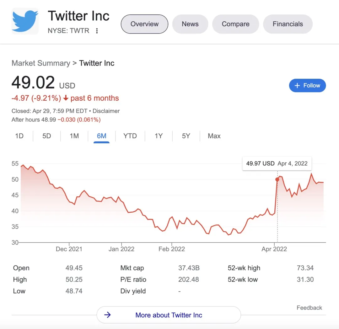 推特股价也随着事态的一波多折,大起大落。他来了,股价单日暴涨27%。他走了,盘前下跌6%。