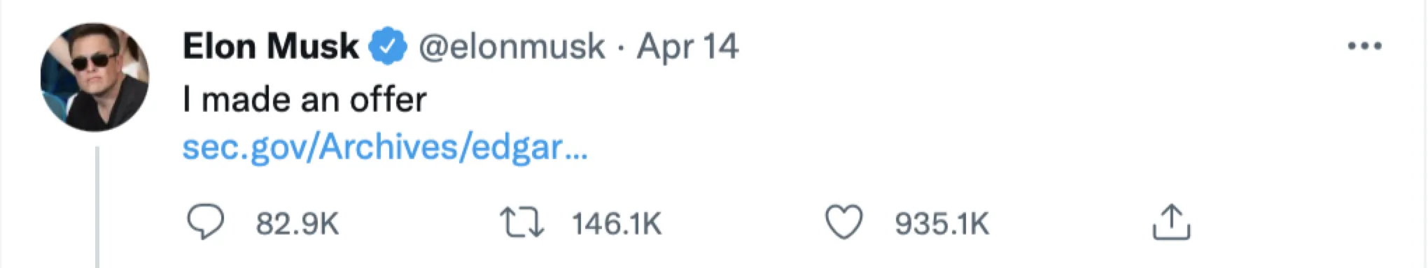 Twitter董事会从一开始的抵制态度,到最终接受,态度转变时间不过10天。问就是440亿美元太香,谁能对霸总说不。