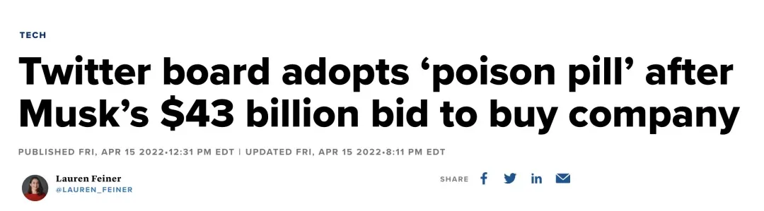 推特也开始了自己的反击。4月15日,董事会宣布将启动“毒丸”计划,即“股权摊薄反收购措施”,以保护公司和股东的利益。虽然没有点名,但就差报马斯克的身份证号了。