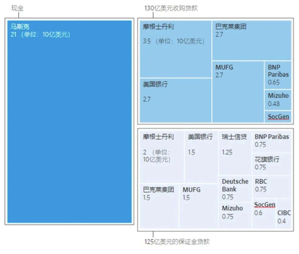 华尔街日报根据SEC资料,披露了此次收购的资金来源:其中130亿美元来自银行贷款,125亿来自保证金贷款(约质押了625亿美元的特斯拉股票),210亿美元来自马斯克本人。