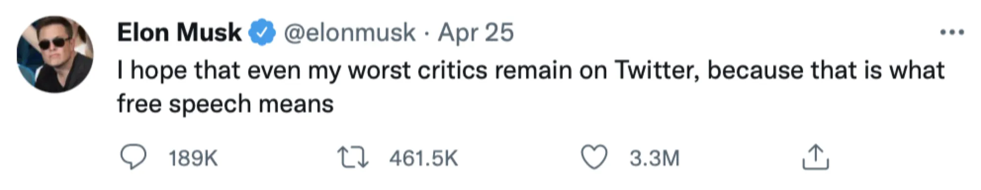 收购完成当天,马斯克在推特上激动发言:“从此以后,大家的言论自由我来守护。”