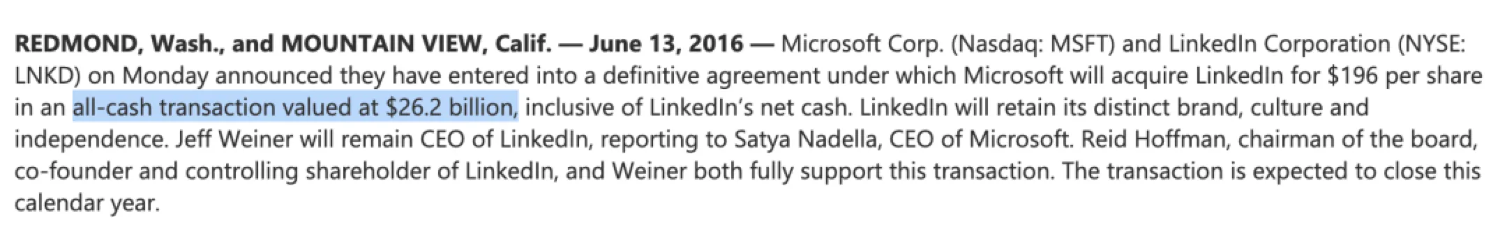 2016年,微软以262亿美元、每股价格196美元,全现金收购LinkedIn。