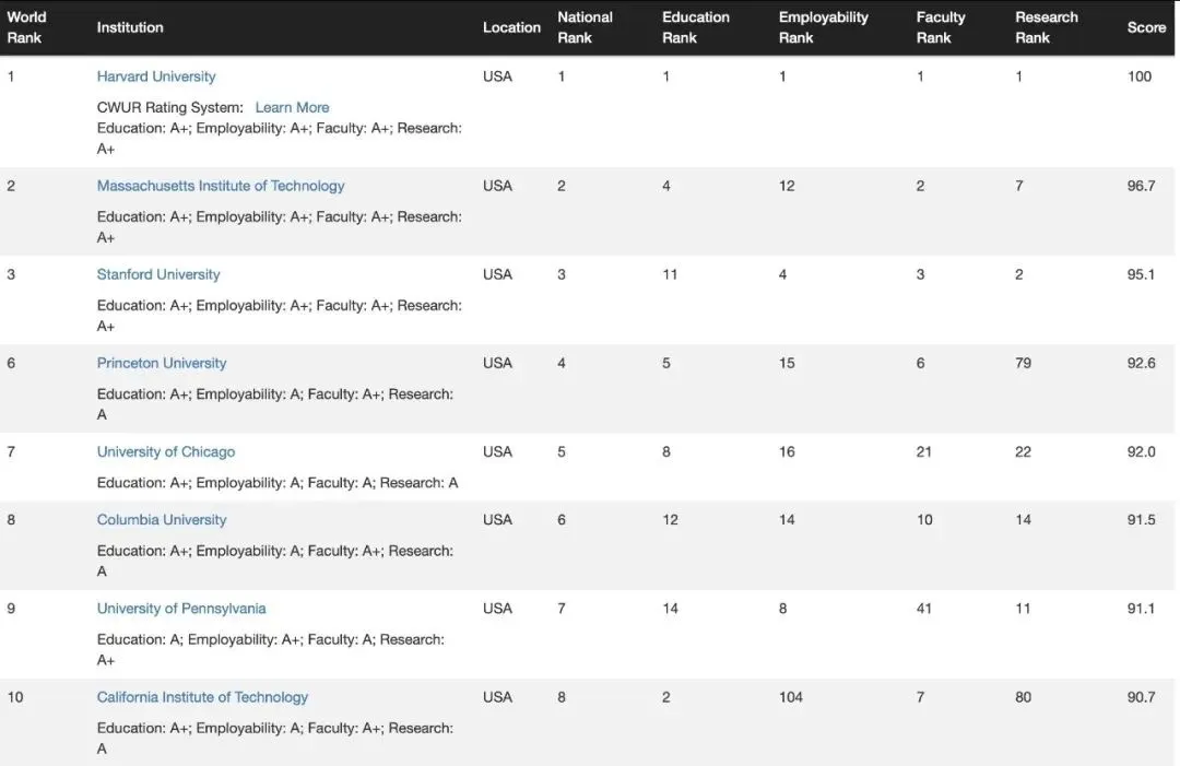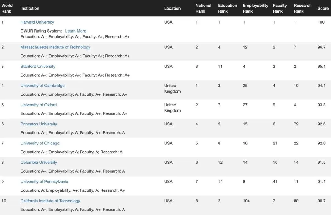 完整CWUR世界百强大学榜单