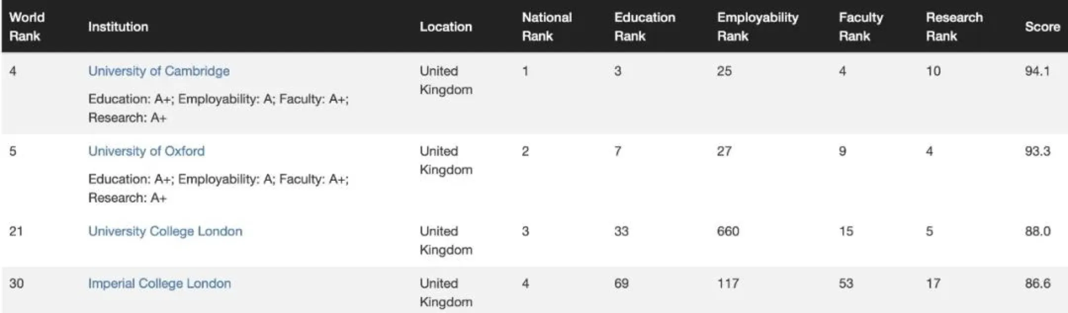 G5有4所进入Top30,依次是:剑桥、牛津、UCL、帝国理工大学,分别位列第4名、5名、21名和30名。