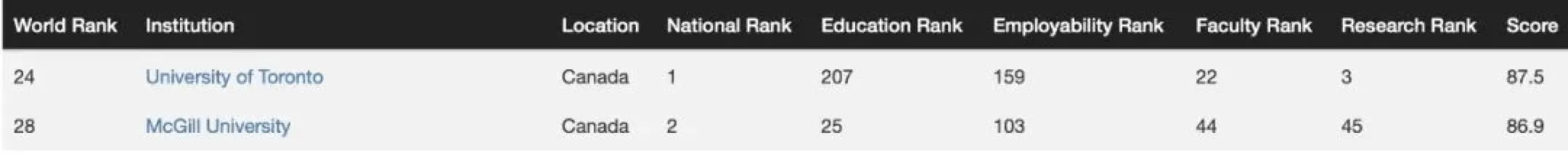 多伦多大学和麦吉尔大学进入Top30,分别位列第24名和28名。